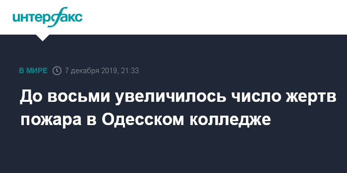 Москва. 7 декабря. INTERFAX.RU - Тела еще трех человек нашли в субботу на месте пожара в здании Одесского колледжа экономики, права и гостинично-ресторанного бизнеса, пожарный скончался в больнице от травм. Таким образом, число погибших увеличилось до восьми, сообщила пресс-служба ГС ЧС Украины.