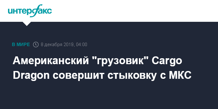 Москва. 8 декабря. INTERFAX.RU - Выведенный на орбиту грузовой корабль Cargo Dragon американской компании SpaceX в воскресенье должен будет состыковаться с Международной космической станцией (МКС), сообщает Национальное управление США по аэронавтике и исследованию космического пространства (NASA).