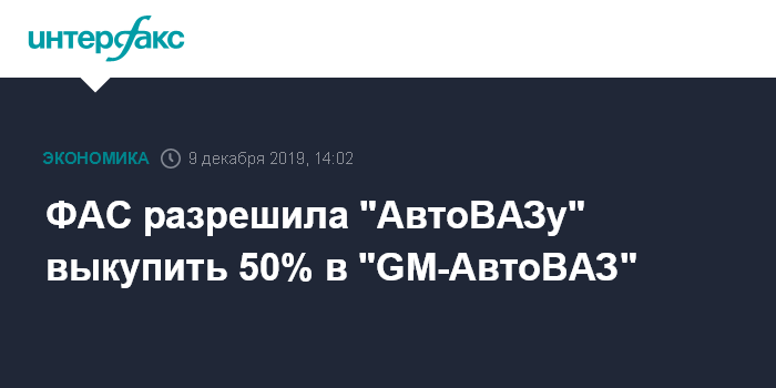 Москва. 9 декабря. INTERFAX.RU - Федеральная антимонопольная служба сообщила, что разрешила "АвтоВАЗу" выкупить 50% голосующих акций в совместном предприятии с американской General Motors (СП "GM-АвтоВАЗ").