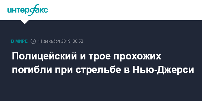 Москва. 11 декабря. INTERFAX.RU - В Нью-Джерси полицейский и трое мирных жителей погибли в результате стрельбы, еще один прохожий ранен, сообщает ABC.