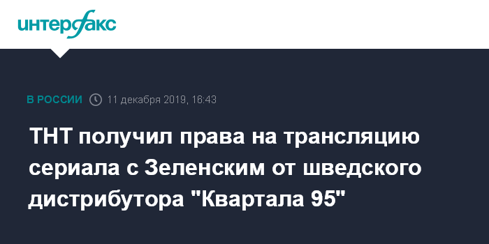 Москва. 11 декабря. INTERFAX.RU - Телеканал ТНТ получил права на трансляцию сериала "Слуга народа" с президентом Украины Владимиром Зеленским от шведской Eccho Rights - дистрибутора студии "Квартал 95", рассказали в пресс-службе студии.