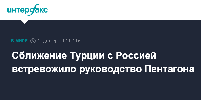 Москва. 11 декабря. INTERFAX.RU - Руководство военного ведомства США обеспокоено растущим партнерством Турции и России, заявил глава Пентагона Марк Эспер.