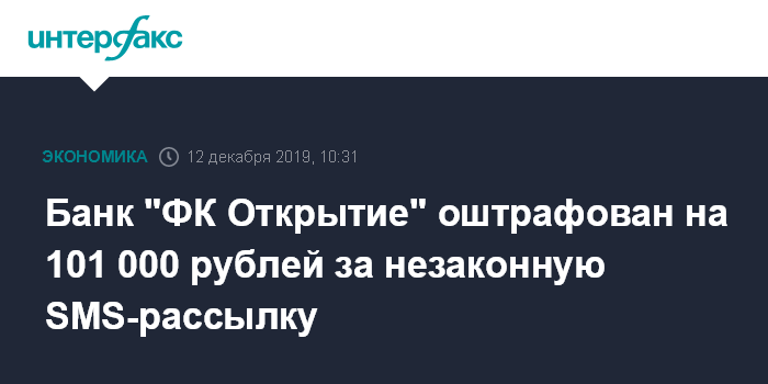 Москва. 12 декабря. INTERFAX.RU - Управление ФАС по Воронежской области оштрафовало на 101 000 рублей банк "ФК Открытие" за рассылку SMS с рекламой без согласия абонента. Ведомство сочло это нарушением закона о рекламе, сообщила пресс-служба управления.