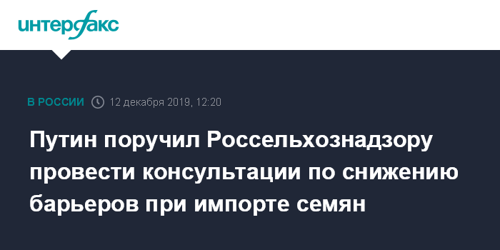 Москва. 12 декабря. INTERFAX.RU - Президент Владимир Путин поручил Россельхознадзору провести дополнительные консультации с бизнесом с тем, чтобы снизить избыточные барьеры при импорте семян. Об этом сообщил глава Минэкономразвития Максим Орешкин на встрече с Ассоциацией европейского бизнеса в четверг в Москве.