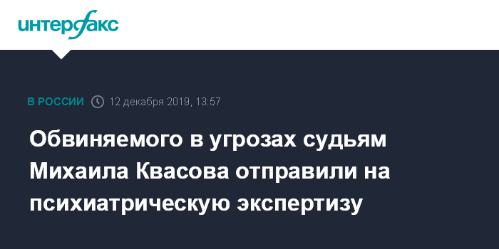 Москва. 12 декабря. INTERFAX.RU - Басманный суд направил в стационар на психиатрическую экспертизу Михаила Квасова, четвертого фигуранта дела о призывах к экстремизму и угрозам в адрес судей. Такое решение судья Елена Николаева вынесла по просьбе следствия.