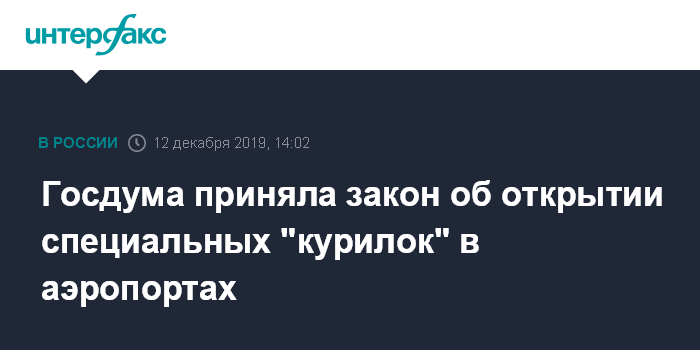 Москва. 12 декабря. INTERFAX.RU - Государственная Дума в четверг приняла в окончательном, третьем чтении закон, разрешающий оборудовать в транзитных зонах аэропортов специальные непрозрачные комнаты для курения.