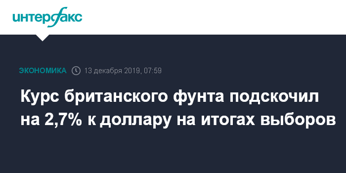 Москва. 13 декабря. INTERFAX.RU - Британская валюта укрепляется в пятницу на фоне сообщений об убедительной победе на всеобщих выборах консерваторов, выступающих за выход Соединенного Королевства из Евросоюза уже в начале 2020 г.