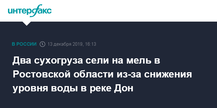 Москва. 13 декабря. INTERFAX.RU - Два груженных пшеницей сухогруза в портах "Азов" и "Ростов-на-Дону" сели на мель при отходе от причала из-за сгона воды в реке Дон (Ростовская область).