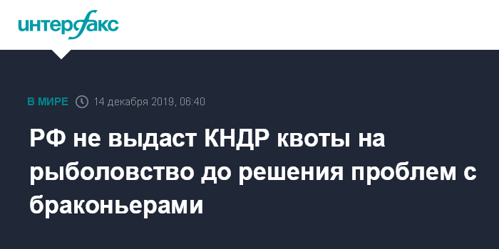Москва. 14 декабря. INTERFAX.RU - Квоты на вылов рыбы в российских водах КНДР сможет получать только тогда, когда будет решен вопрос с браконьерством, сообщил в эфире радио "Владивосток ФМ" чрезвычайный и полномочный посол России в КНДР Александр Мацегора.