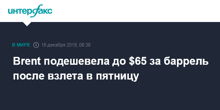 К 8:15 по московскому времени февральские фьючерсы на Brent дешевели на лондонской бирже ICE Futures на $0,22 (0,34%) к уровню закрытия предыдущей сессии, до $65 за баррель. За пятницу Brent подорожала на $1,02 (1,59%), до $65,22 за баррель.