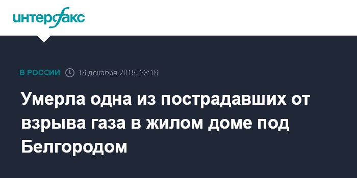 Москва. 16 декабря. INTERFAX.RU - Одна из женщин, пострадавших от взрыва газа 3 декабря в жилом доме в поселке Яковлево Белгородской области, умерла в реанимации, сообщает пресс-служба областного правительства в понедельник.