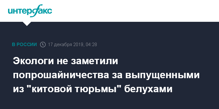 Москва. 17 декабря. INTERFAX.RU - Эксперты коалиции экологических организаций "Свободу косаткам и белухам" в ходе мониторинга за выпущенными в Приморье 50 белухами из "китовой тюрьмы" установили, что они держатся группами и самостоятельно охотятся.