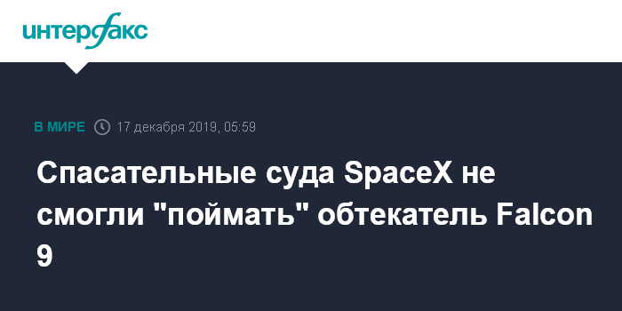 Москва. 17 декабря. INTERFAX.RU - Спасательным судам не удалось поймать в надводные сети створки головного обтекателя ракеты Falcon 9 после ее запуска во вторник с авиабазы на мысе Канаверал, сообщила в твиттере компания-разработчик SpaceX.