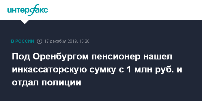 Москва. 17 декабря. INTERFAX.RU - Пожилой житель Новосергиевского района Оренбургской области передал полиции найденную на улице инкассаторскую сумку с крупной суммой денег, сообщает пресс-служба регионального УМВД .