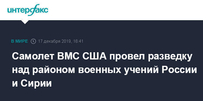 Москва. 17 декабря. INTERFAX.RU - Патрульный противолодочный самолет ВМС США P-8A Poseidon во вторник провел многочасовой полет вблизи сирийского побережья, где начались учения ВМФ России и ВМС Сирии, следует из мониторинговых данных западных авиационных ресурсов.
