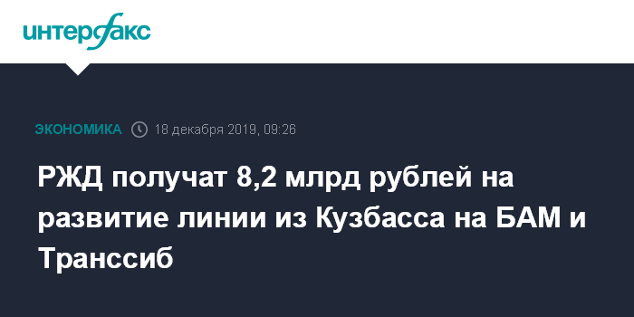 Москва. 18 декабря. INTERFAX.RU - ОАО "Российские железные дороги" получит 8,23 млрд рублей на финансирование проекта по развитию участка Междуреченск-Тайшет, обеспечивающего выход грузов из Кузбасса на Транссибирскую и Байкало-Амурские магистрали.