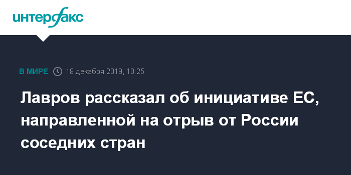 Москва. 18 декабря. INTERFAX.RU - Инициатива Евросоюза "Восточное партнерство" направлена на отрыв от России ближайших стран-соседей, считает министр иностранных дел РФ Сергей Лавров.