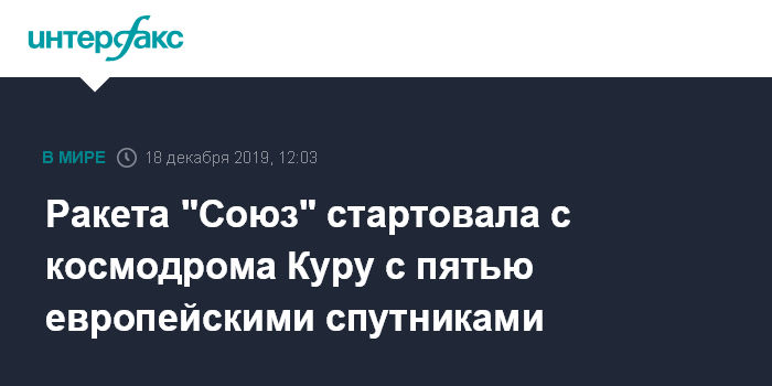 Москва. 18 декабря. INTERFAX.RU - Ракета-носитель "Союз-СТ-А" с пятью европейскими космическими аппаратами в среду успешно стартовала на орбиту с космодрома Куру во Французской Гвиане, сообщает компания-оператор Arianespace, обслуживающая полет.