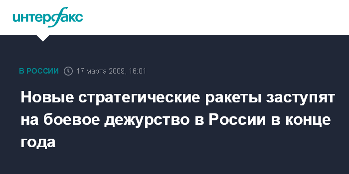 Москва. 17 марта. INTERFAX.RU - Первые межконтинентальные баллистические ракеты нового поколения РС-24 заступят на боевое дежурство в Ракетных войсках стратегического назначения (РВСН) России в декабре, сообщил командующий РВСН генерал-полковник Николай Соловцов.