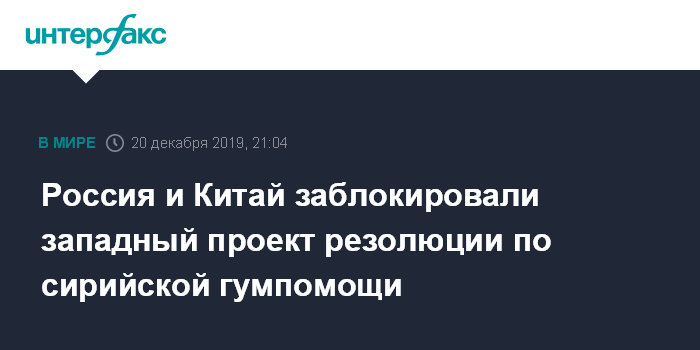 Москва. 20 декабря. INTERFAX.RU - Россия и Китай в пятницу заветировали проект резолюции "гуманитарной тройки" в Совете Безопасности - Бельгии, Германии и Кувейта - о продлении на год трансграничных операций по доставке гуманитарной помощи Сирии.