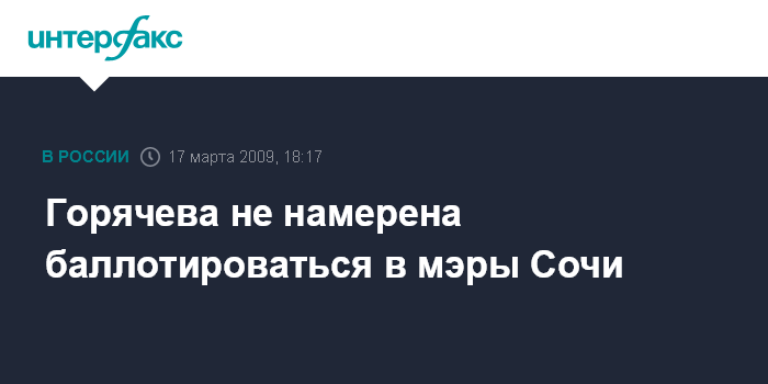 Москва. 17 марта. INTERFAX.RU - Депутат Госдумы Светлана Горячева категорически опровергла возможность своего участия в выборах мэра Сочи от партии "Справедливая Россия".