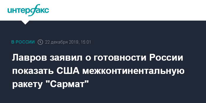 Москва. 22 декабря. INTERFAX.RU - Россия будет готова показать США новую межконтинентальную баллистическую ракету (МБР) "Сармат", заявил глава МИД РФ Сергей Лавров.