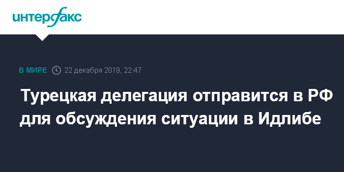 Москва. 22 декабря. INTERFAX.RU - Турецкие переговорщики отправятся в понедельник в Россию, чтобы обсудить развитие ситуации в сирийской провинции Идлиб, приводит агентство "Анадолу" слова президента Турции Реджепа Тайипа Эрдогана.
