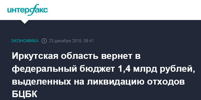 Москва. 23 декабря. INTERFAX.RU - Администрация Иркутской области вернет в федеральный бюджет 1,4 млрд рублей из 1,8 миллиарда, выделенных в 2019 году на ликвидацию отходов Байкальского целлюлозо-бумажного комбината, сообщила и.о. главы Минфина региона Наталия Бояринова.