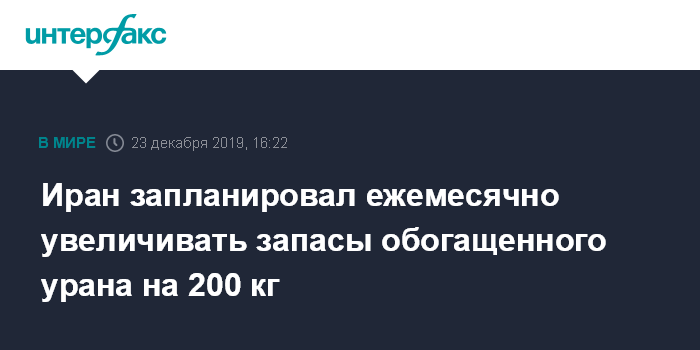 Москва. 23 декабря. INTERFAX.RU - Иран располагает в настоящее время 800 кг обогащенного урана, и каждый месяц его запасы будут увеличиваться примерно на 200 кг, сообщил в понедельник глава Организации по атомной энергии республики Али Акбар Салехи, слова которого приводят иранские СМИ.