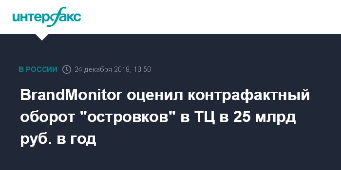Москва. 24 декабря. INTERFAX.RU - В торговых центрах есть точки, где доля контрафактных товаров доходит до 60% ассортимента и где общий оборот подделок превышает 25 млрд рублей в год, показало исследование юридической компании BrandMonitor. По ее данным, контрафакт продают в "островках" - на небольших отдельно стоящих прилавках в зонах плотного трафика покупателей.