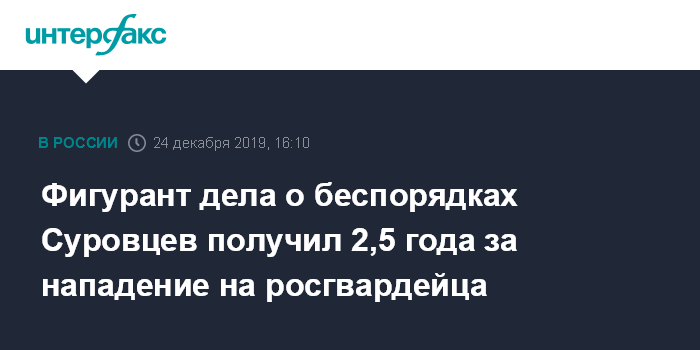 Москва. 24 декабря. INTERFAX.RU - Тверской суд Москвы во вторник приговорил к 2,5 годам колонии Сергея Суровцева, обвиняемого в применении насилия в отношении представителя власти в ходе протестной акции 27 июля в центре Москвы, передает корреспондент "Интерфакса" из зала суда.