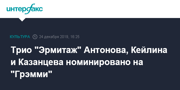 Москва. 24 декабря. INTERFAX.RU - Российские музыканты Сергей Антонов (виолончель), Миша Кейлин (скрипка) и Илья Казанцев (фортепиано) в составе фортепьянного трио "Эрмитаж" (Hermitage Piano Triо) стали номинантами 62-й премии "Грэмми" (Grammy Awardes).