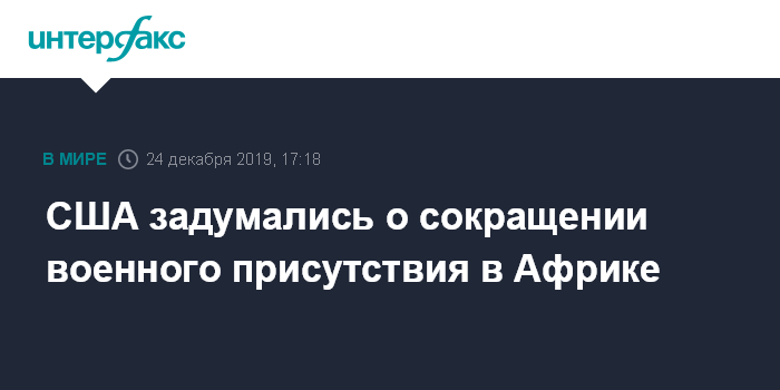 Москва. 24 декабря. INTERFAX.RU - Глава Пентагона Марк Эспер рассматривает предложения о сокращении или полном выводе подразделений американских вооруженных сил из стран Западной Африки, сообщает во вторник американская газета The New York Times.