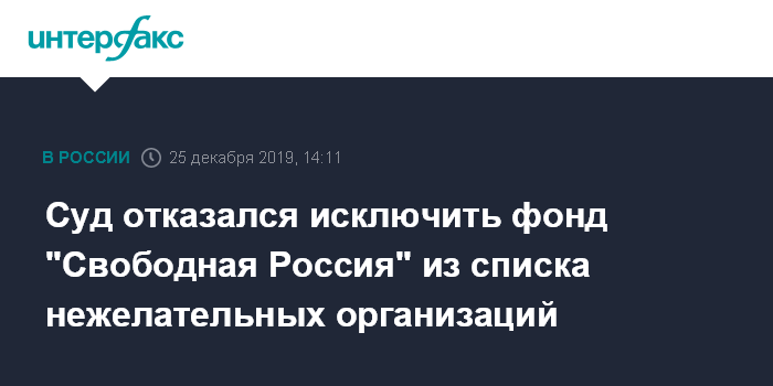 Москва. 25 декабря. INTERFAX.RU - В Москве Тверской суд отказался исключить американский фонд "Свободная Россия" (Free Russia Foundation/Free Russia) из перечня иностранных неправительственных организаций, деятельность которых нежелательна в России. Иск подал сам фонд.