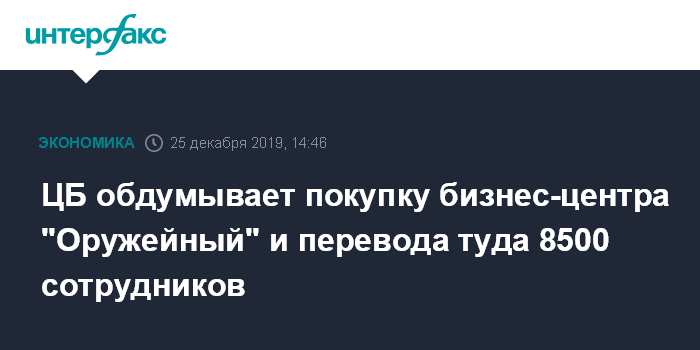 Ранее о планах ЦБ купить "Оружейный" рассказывали источники "Интерфакса". Информированный о планах регулятора собеседник говорил, что сделка может состояться до конца 2019 года и ее сумма может составить примерно 88 млрд рублей. О переговорах ЦБ с нынешними владельцами здания - "Мегафоном" и Сбербанком - в июне рассказывали другие источники.