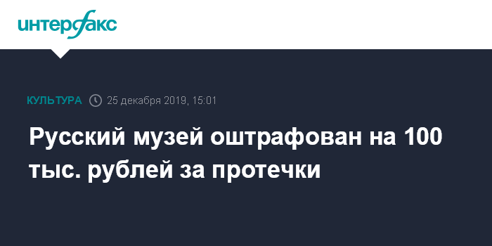 Москва. 25 декабря. INTERFAX.RU - В Петербурга Дзержинский суд оштрафовал Русский музей на 100 тыс. рублей за то, что в помещениях фондов произошла протечка и были повреждены штукатурка и краска на стенах, сообщила объединенная пресс-служба городских судов.