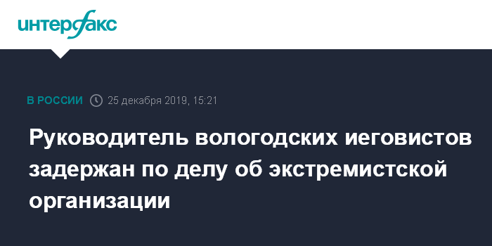 Москва. 25 декабря. INTERFAX.RU - В отношении руководителя вологодской организации "Свидетелей Иеговы" (запрещена в РФ) и его соратника возбуждено уголовное дело по части 1 статьи 282.2 УК РФ (организация деятельности экстремистской организации), сообщили в среду "Интерфаксу" в Следственном комитете РФ.