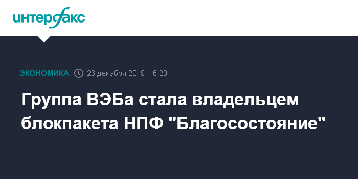 Москва. 26 декабря. INTERFAX.RU - "ВЭБ-лизинг", входящий в группу ВЭБа, стал владельцем блокирующего пакета акций НПФ "Благосостояние", сообщила компания на ленте раскрытия информации.
