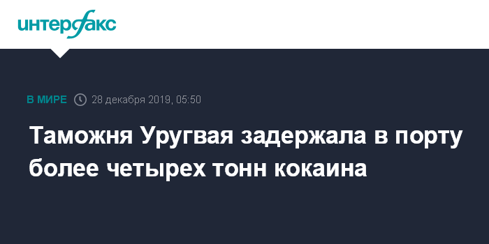 Москва. 28 декабря. INTERFAX.RU - Таможней уругвайского порта Монтевидео совместно с сотрудниками ВМС страны были задержаны контейнеры, в которых обнаружена партия кокаина, общий вес которой составил 4,4 т, сообщили таможенные власти страны.