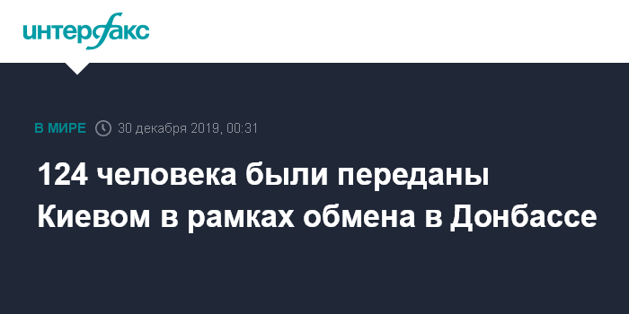 Москва. 30 декабря. INTERFAX.RU - В рамках состоявшегося в воскресенье в Донбассе обмена между Киевом и самопровозглашенными республиками ДНР и ЛНР последним были переданы 124 человека, заявила представитель Украины в гуманитарной подгруппе Валерия Лутковская.