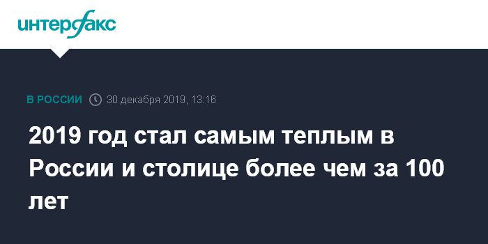 Москва. 30 декабря. INTERFAX.RU - Среднегодовая температура в 2019 году стала самой высокой за всю историю инструментальных метеонаблюдений в России в целом и в Москве в частности, сообщил "Интерфаксу" и.о. директора Гидрометцентра РФ Роман Вильфанд.