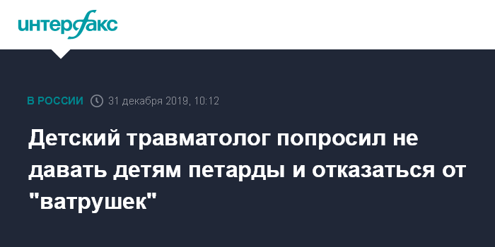 Москва. 31 декабря. INTERFAX.RU - Отказаться от катания на "ватрушках" и не давать маленьким детям самим взрывать петарды рекомендует заместитель директора НИИ неотложной детской хирургии и травматологии (Центр Рошаля) по лечебной работе Александр Брянцев.