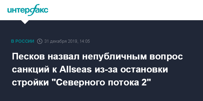 Москва. 31 декабря. INTERFAX.RU - Возможность введения Россией санкций в отношении швейцарской компании Allseas из-за приостановки ее участия в строительстве газопровода "Северный поток 2" является коммерческим и не публичным вопросом, заявил пресс-секретарь президента РФ Дмитрий Песков.