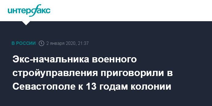 Москва. 2 января. INTERFAX.RU - Нахимовский районный суд Севастополя приговорил бывшего начальника строительного управления №7 АО "Главного управления обустройства войск" к 13 годам колонии и 310 млн рублей штрафа за взяточничество, сообщила прокуратура района.