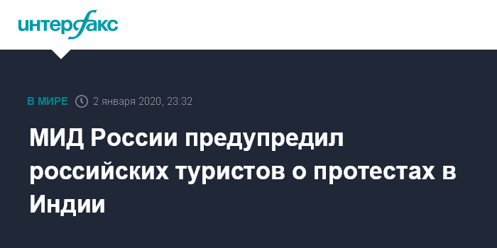 Москва. 2 января. INTERFAX.RU - Российских туристов предупредили о массовых протестах в крупных городах Индии 3 января, сообщает в четверг ситуационно-кризисный центр МИД РФ (ДСКЦ) в твиттере.