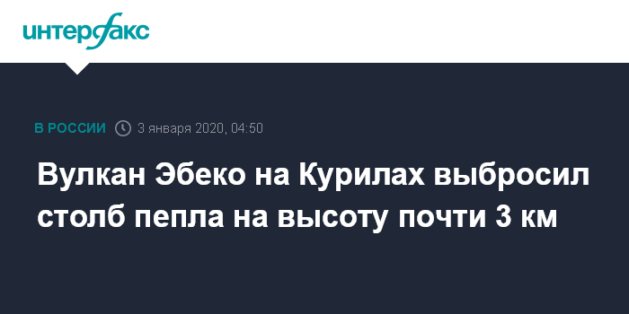 Москва. 3 января. INTERFAX.RU - Пепловый выброс произошел в пятницу днем на вулкане Эбеко, расположенном на острове Парамушир (Северные Курилы, Сахалинская область).