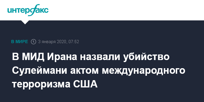 Москва. 3 января. INTERFAX.RU - Глава иранского МИД Джавад Зариф заявил, что убийство при ударе по аэропорту Багдада командующего подразделением "Кудс" Корпуса стражей Исламской революции Касема Сулеймани является "актом международного терроризма США".