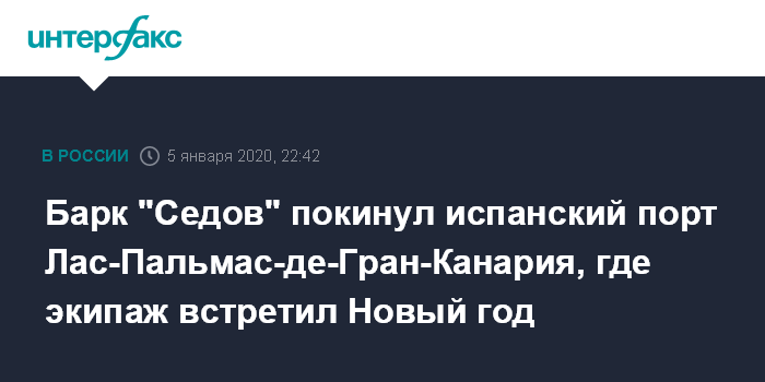 Москва. 5 января. INTERFAX.RU - Российский парусник "Седов" продолжил кругосветное плавание, покинув испанский порт Лас-Пальмас-де-Гран-Канария вечером в воскресенье, сообщил медиацентр похода.