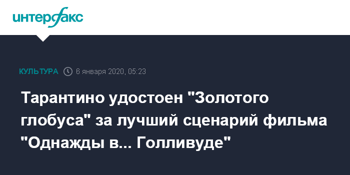 Москва. 6 января. INTERFAX.RU - Режиссёр Квентин Тарантино стал обладателем "Золотого глобуса" в номинации "Лучший сценарий" за фильм "Однажды в... Голливуде".