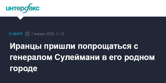 Эта церемония прощания станет финальной перед погребением Сулеймани. Похороны иранского генерала, как ожидается, состоятся с 14:00 по местному времени (13:00 по Москве) до 16:00 на кладбище мучеников в Кермане.